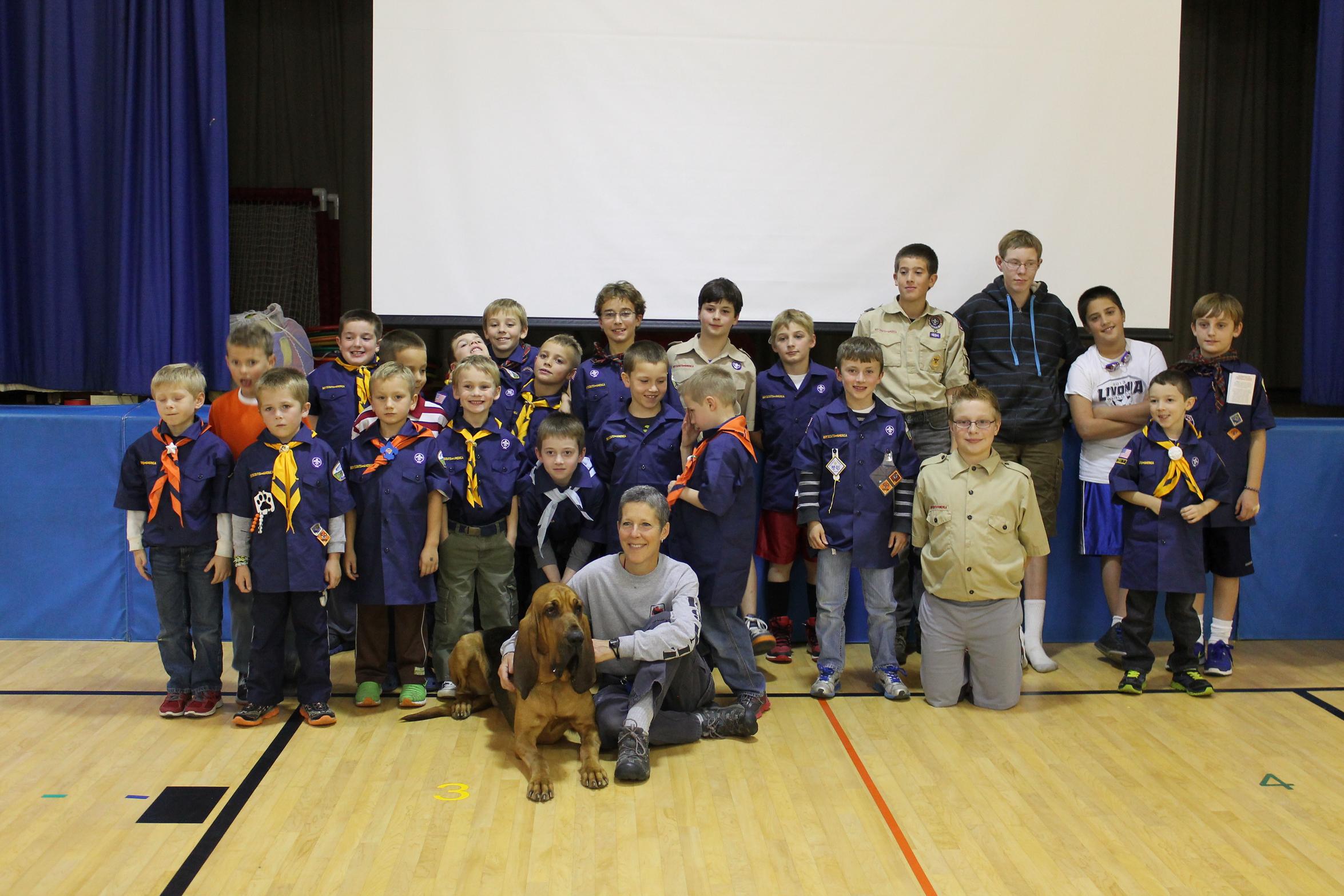 On November 1st, ISRCH’s CRT Davenport [Canine Response Team]-was pleased to be asked to make a presentation to the local Boy Scouts & Cub Scout packs. Aik participated in a mock search as part of a skit put on by the pack of which our own Kenny Smith [Jess Silvernail’s son] is a member. Aik had a wonderful time with his trail…finding ‘lost’ Kenny through a crowd of people. The boys all had a great time hugging and mugging with Aik and they even listed to the “Lost & Found, but Safe and Sound” video we played for them. They had some great questions and all were very attentive during our presentation about safety while hiking…